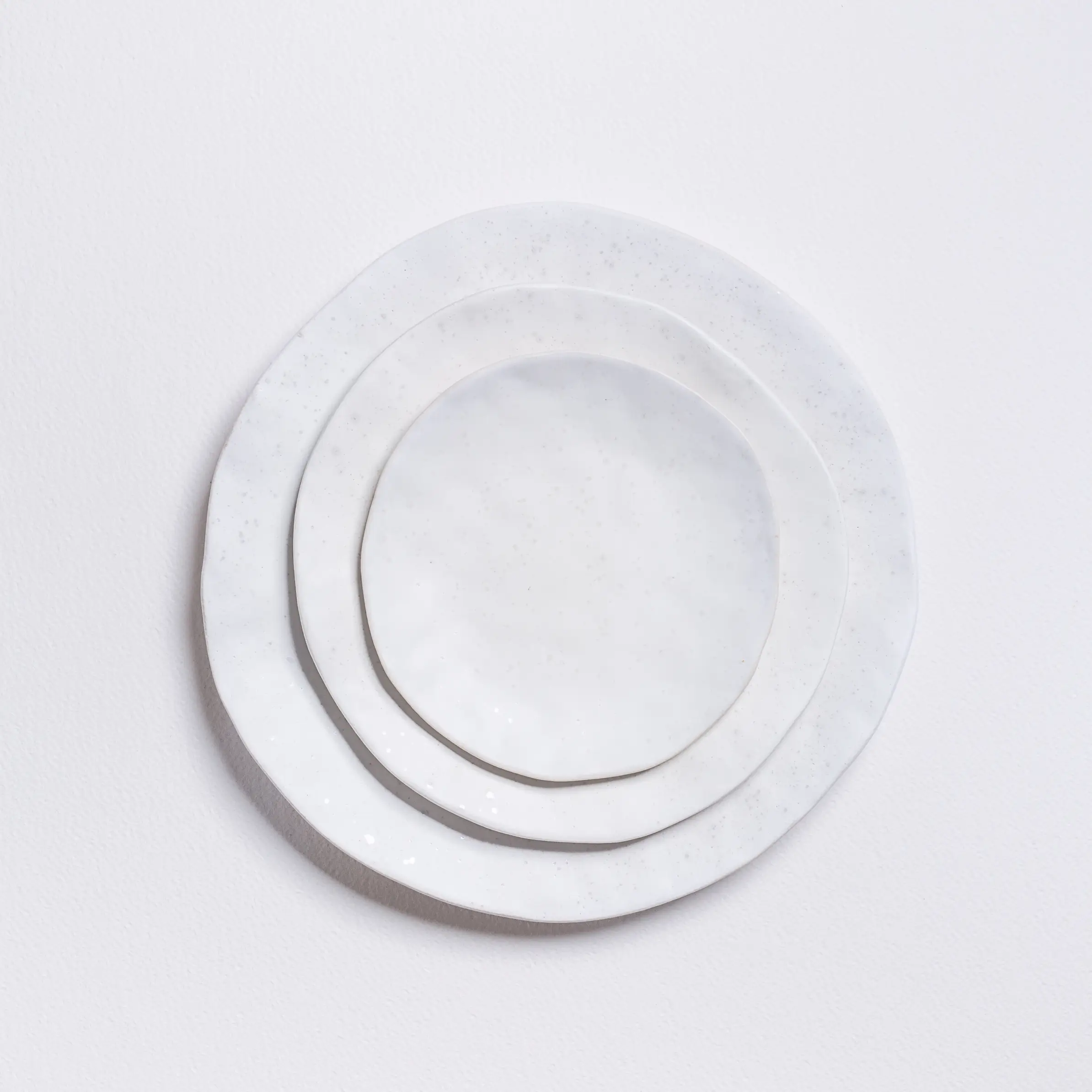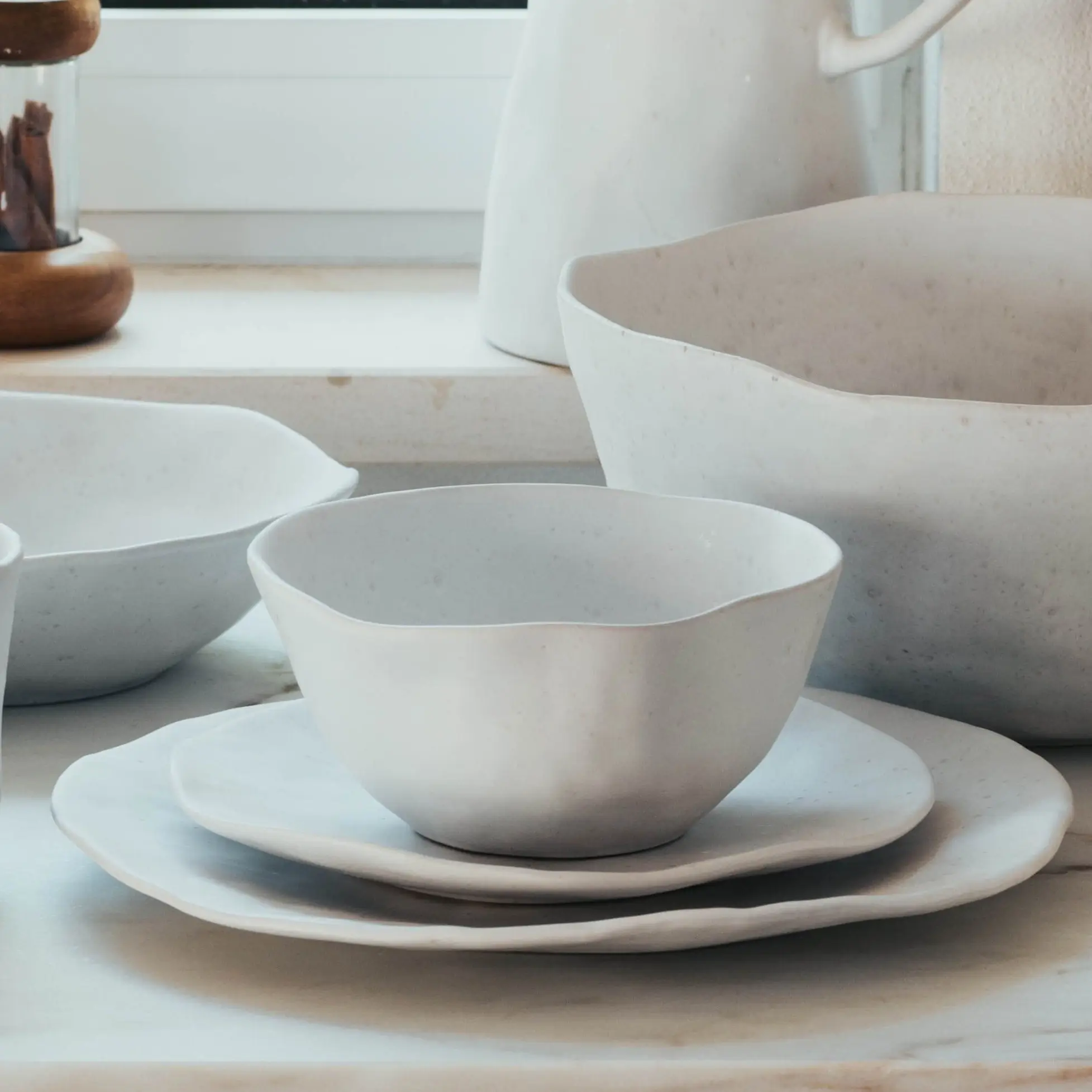 Enjoy your meals with our white, lead free 24 pieces dinner set. These unique, handmade pieces feature a white matte finish with uneven organic shape, perfect for any occasion.