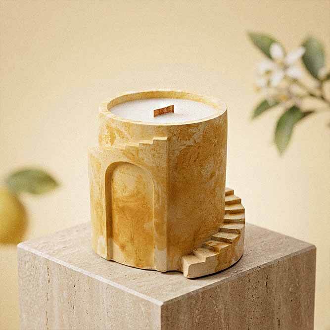 The cement vessel is handmade with an architectural arch design that makes it a statement piece whether it is lit or not. The warm golden tones photograph beautifully and sit naturally in earthy, minimalist, or maximalist spaces alike. No two vessels come out exactly the same. Once the wax is finished, clean it out and use it as a planter, a desk organizer, or a decorative accent.